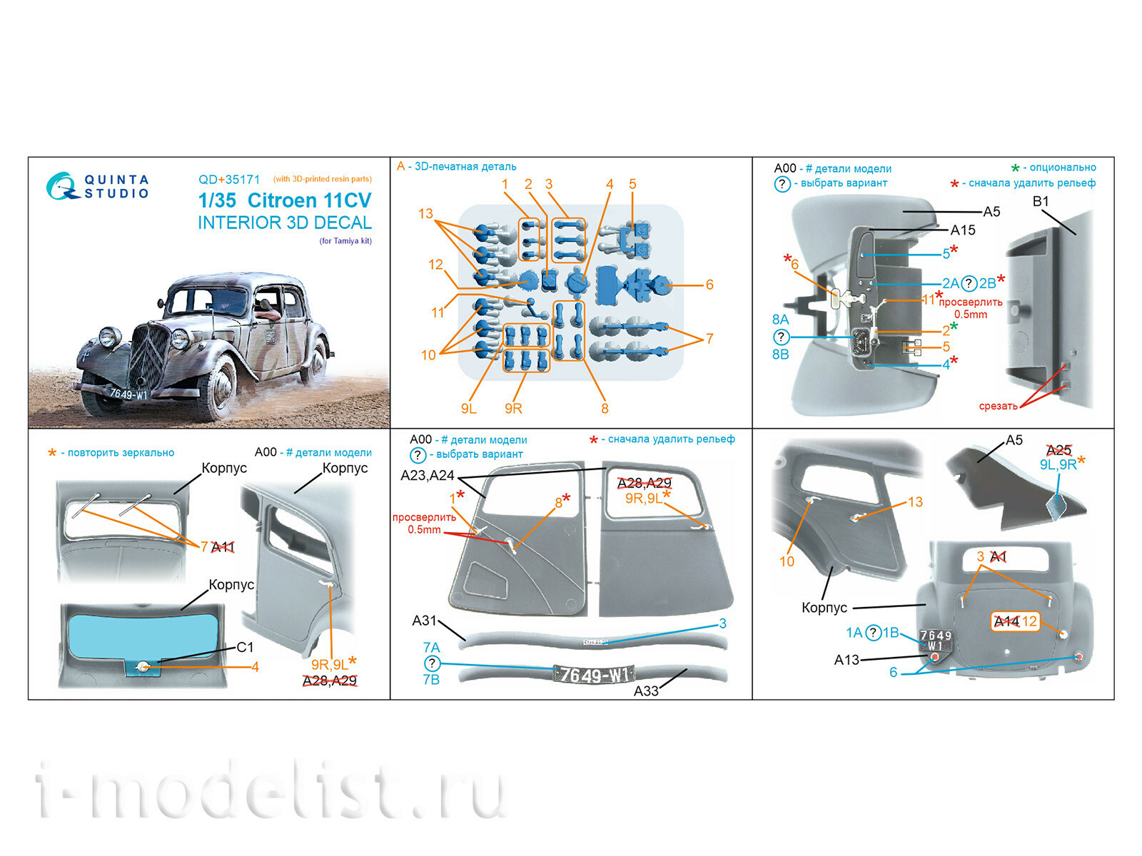 QD+35171 Quinta Studio 1/35 3D Декаль интерьера кабины Citroen 11CV (Tamiya) (с 3D-печатными деталями)