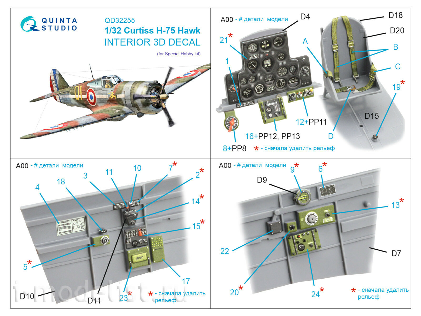 QD32255 Quinta Studio 1/32 3D Декаль интерьера кабины Curtiss H-75 Hawk (Special Hobby)