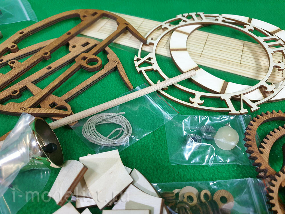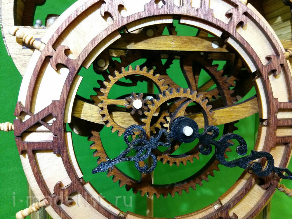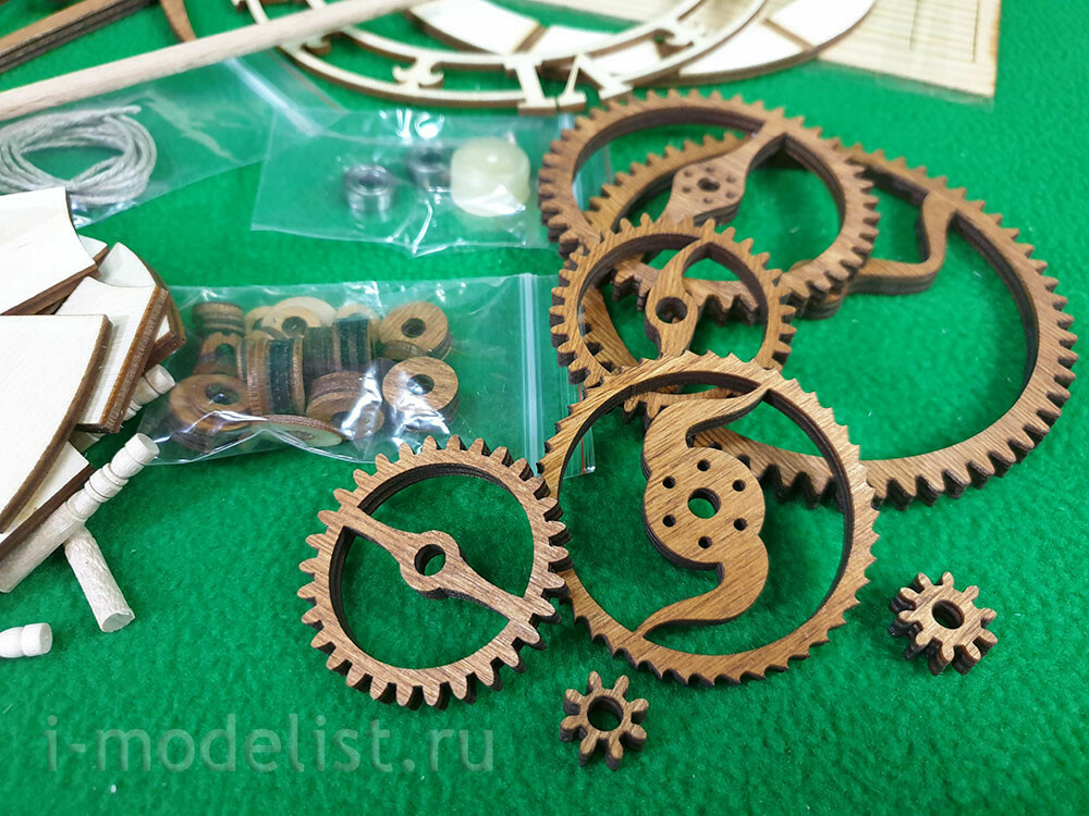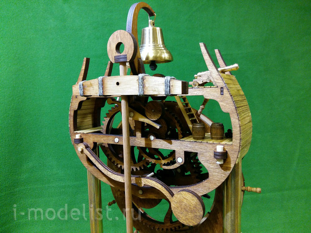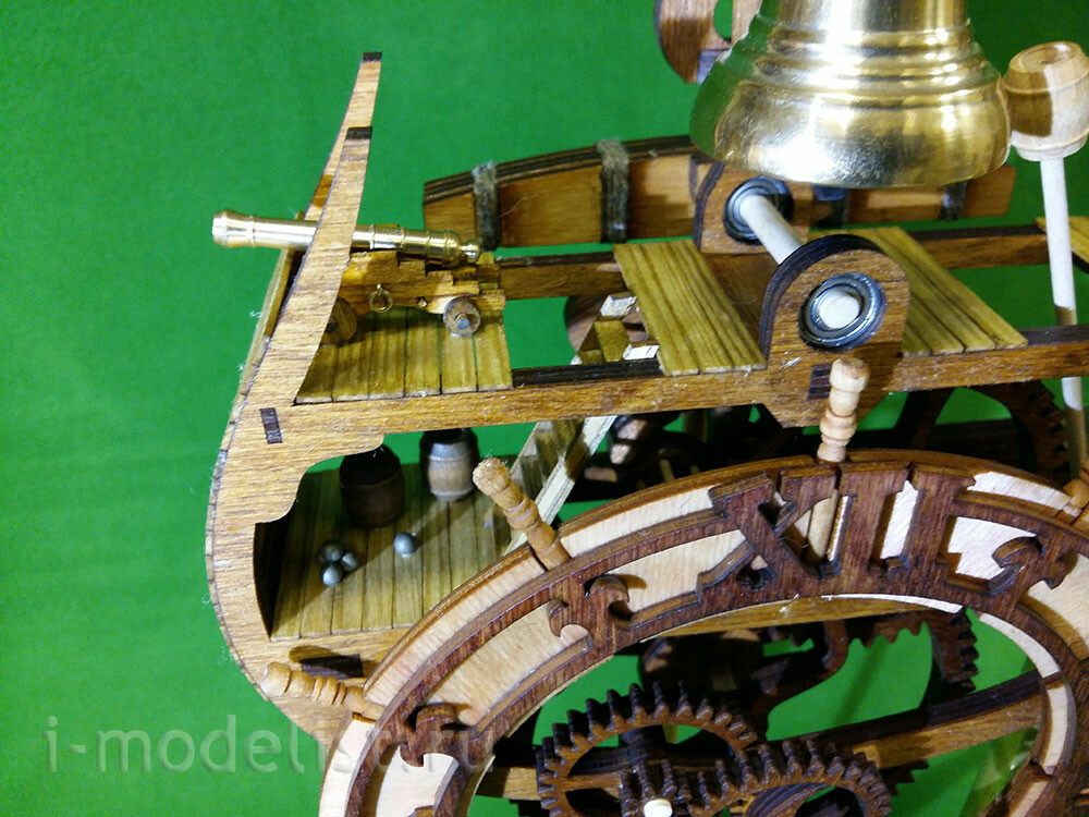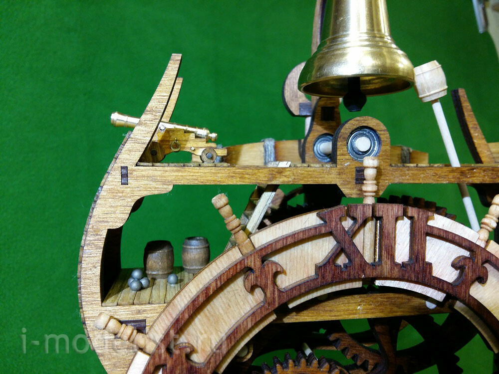 В конструкции данных часов мы попытались совместить часовой механизм и корабельную тему: корпус часов стилизован под разрез парусного фрегата, добавлен непременный для такого случая антураж - пушка, рында, бочки и т.д. Рында, кстати, действующая - часы отбивают "склянки"каждый час. Привод маятника - электромагнитный, точность хода подстраивается перемещением "якоря" на стреле маятника. Ось маятника посажена на подшипники для устранения люфтов и обеспечения легкости хода. Деревянные детали в данной модели, в том числе все шестерни, очень удачно гармонируют с латунными: из латуни в часах изготовлены стойки, колокол, пушка, а также втулка часовой стрелки. Все эти детали идут в наборе уже в готовом виде.