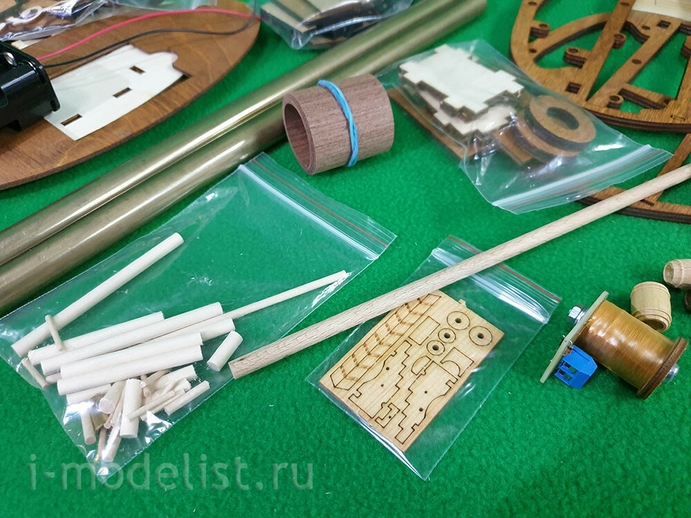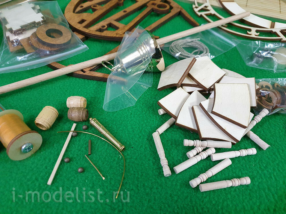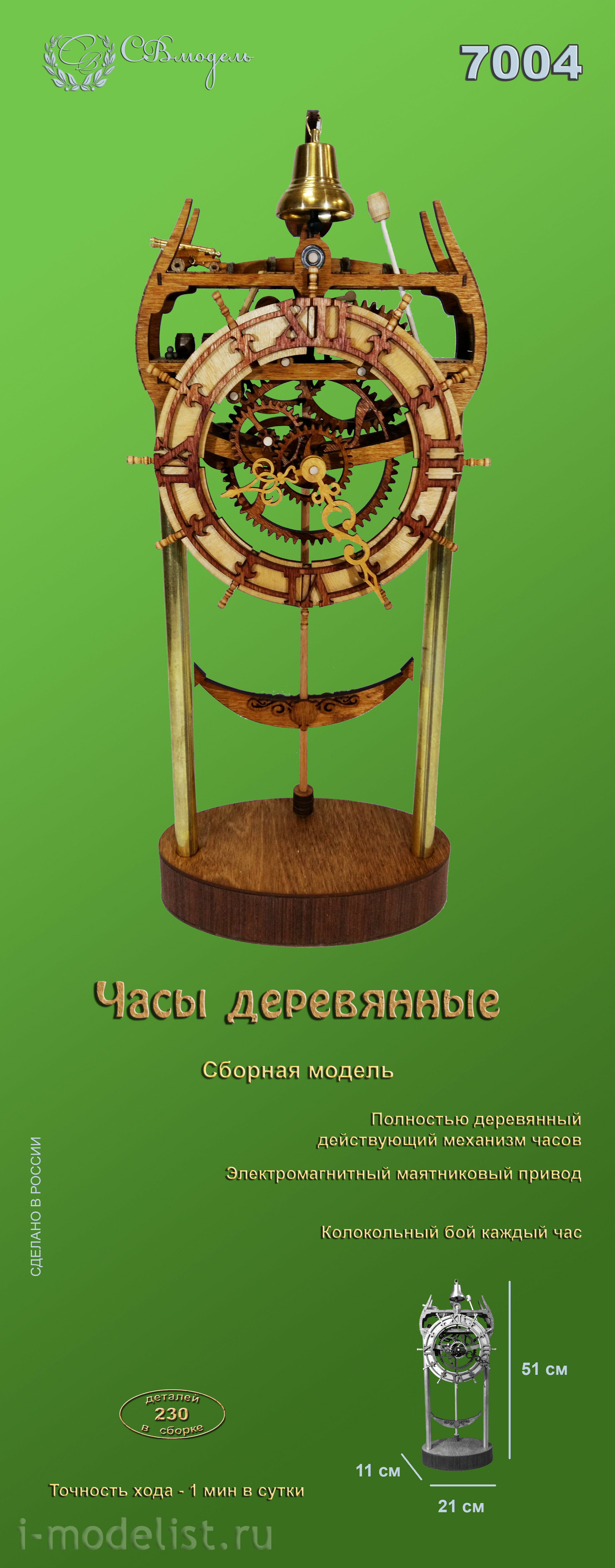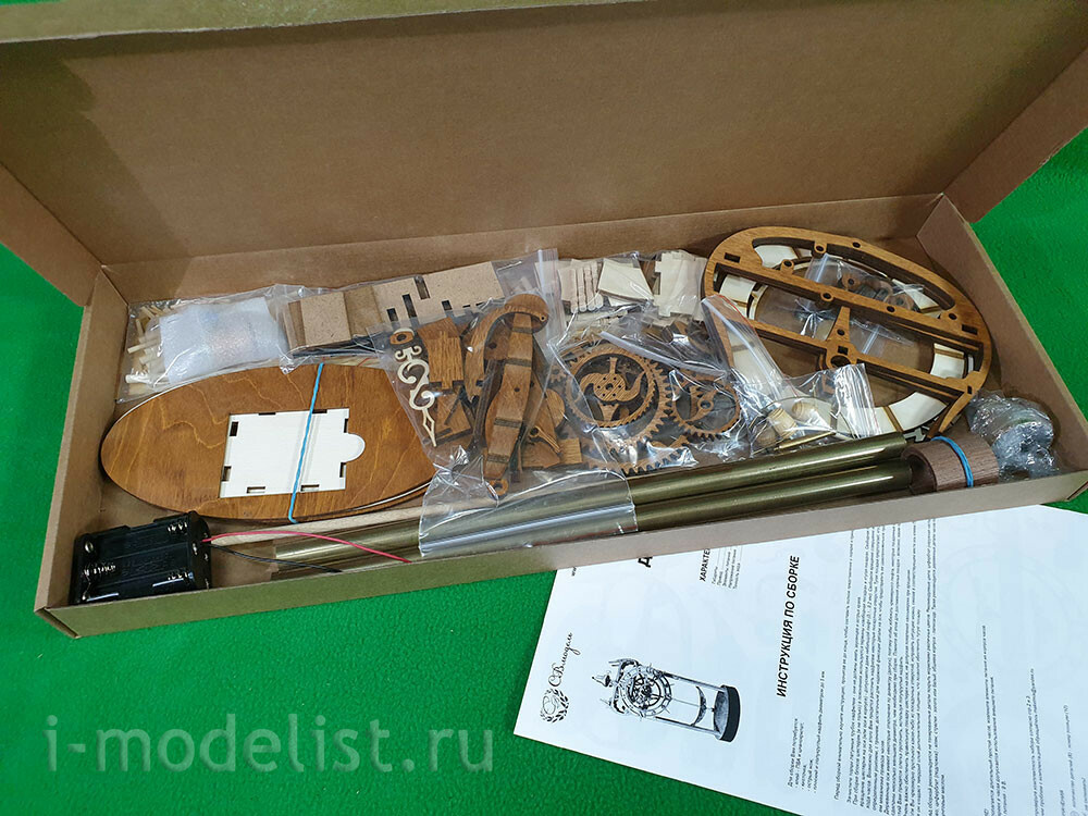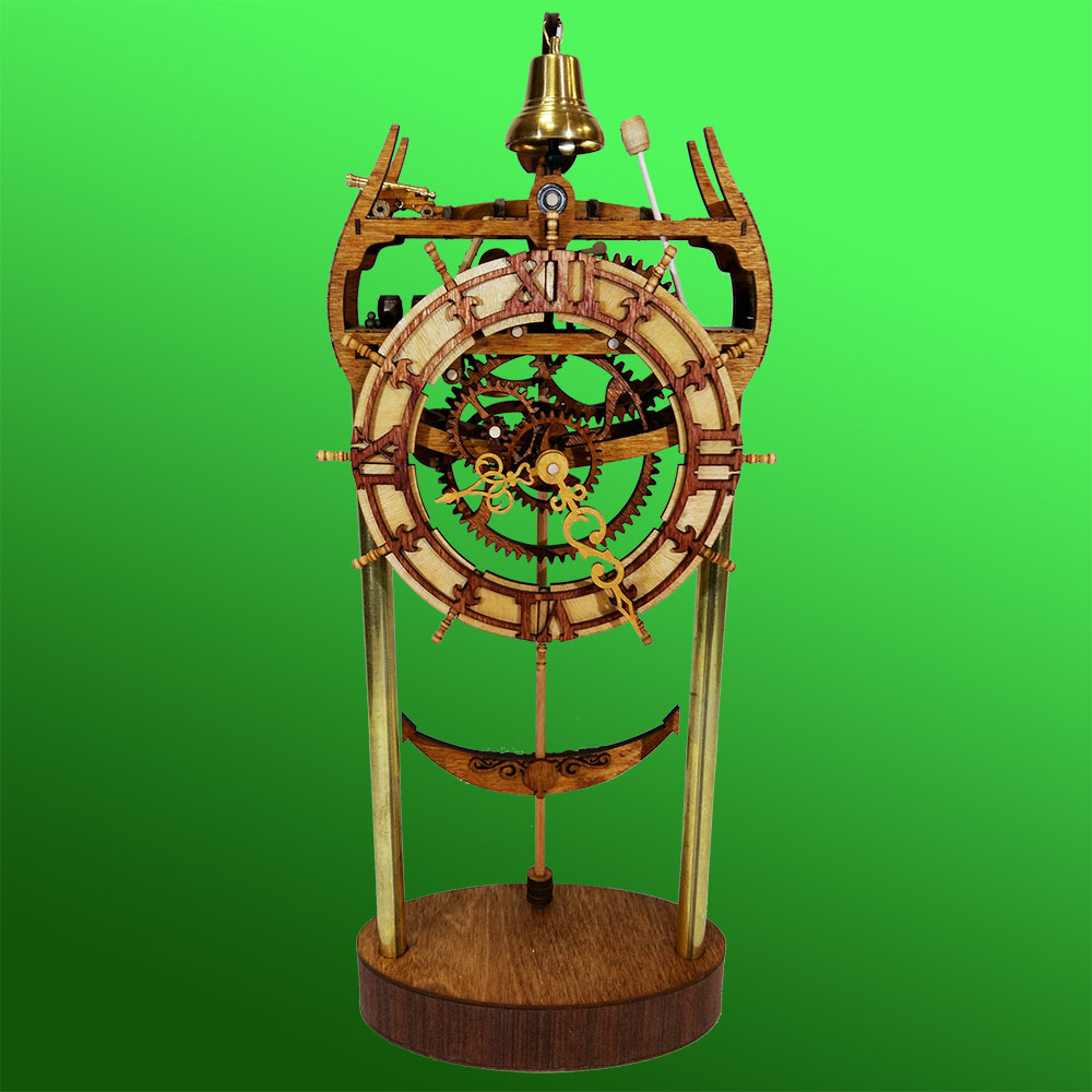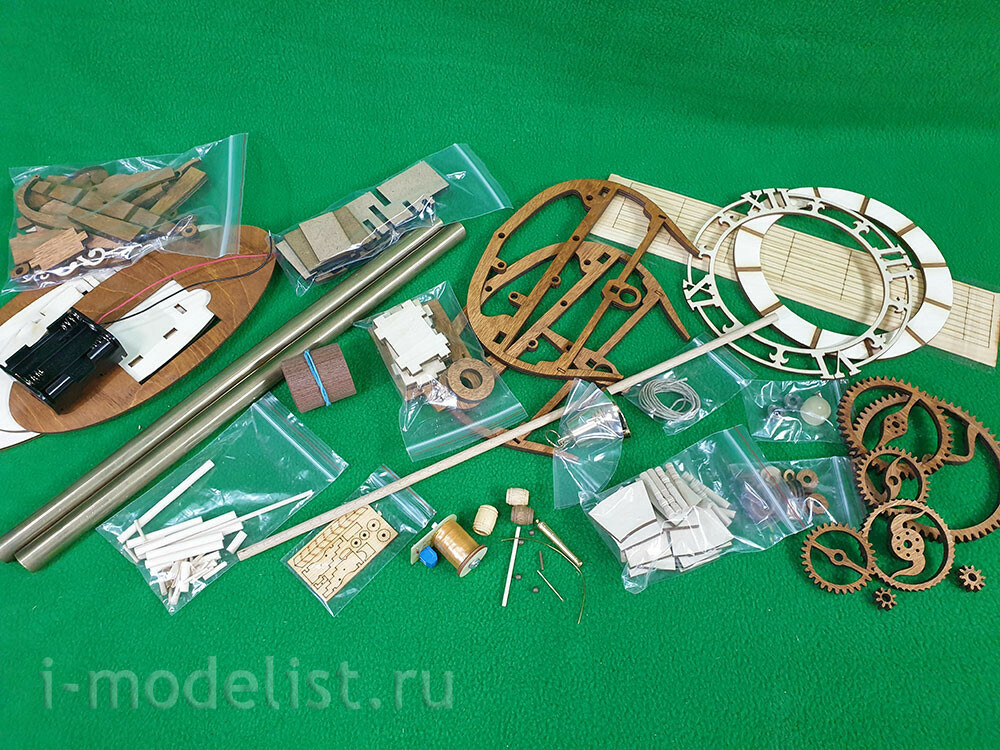 В конструкции данных часов мы попытались совместить часовой механизм и корабельную тему: корпус часов стилизован под разрез парусного фрегата, добавлен непременный для такого случая антураж - пушка, рында, бочки и т.д. Рында, кстати, действующая - часы отбивают "склянки"каждый час. Привод маятника - электромагнитный, точность хода подстраивается перемещением "якоря" на стреле маятника. Ось маятника посажена на подшипники для устранения люфтов и обеспечения легкости хода. Деревянные детали в данной модели, в том числе все шестерни, очень удачно гармонируют с латунными: из латуни в часах изготовлены стойки, колокол, пушка, а также втулка часовой стрелки. Все эти детали идут в наборе уже в готовом виде.