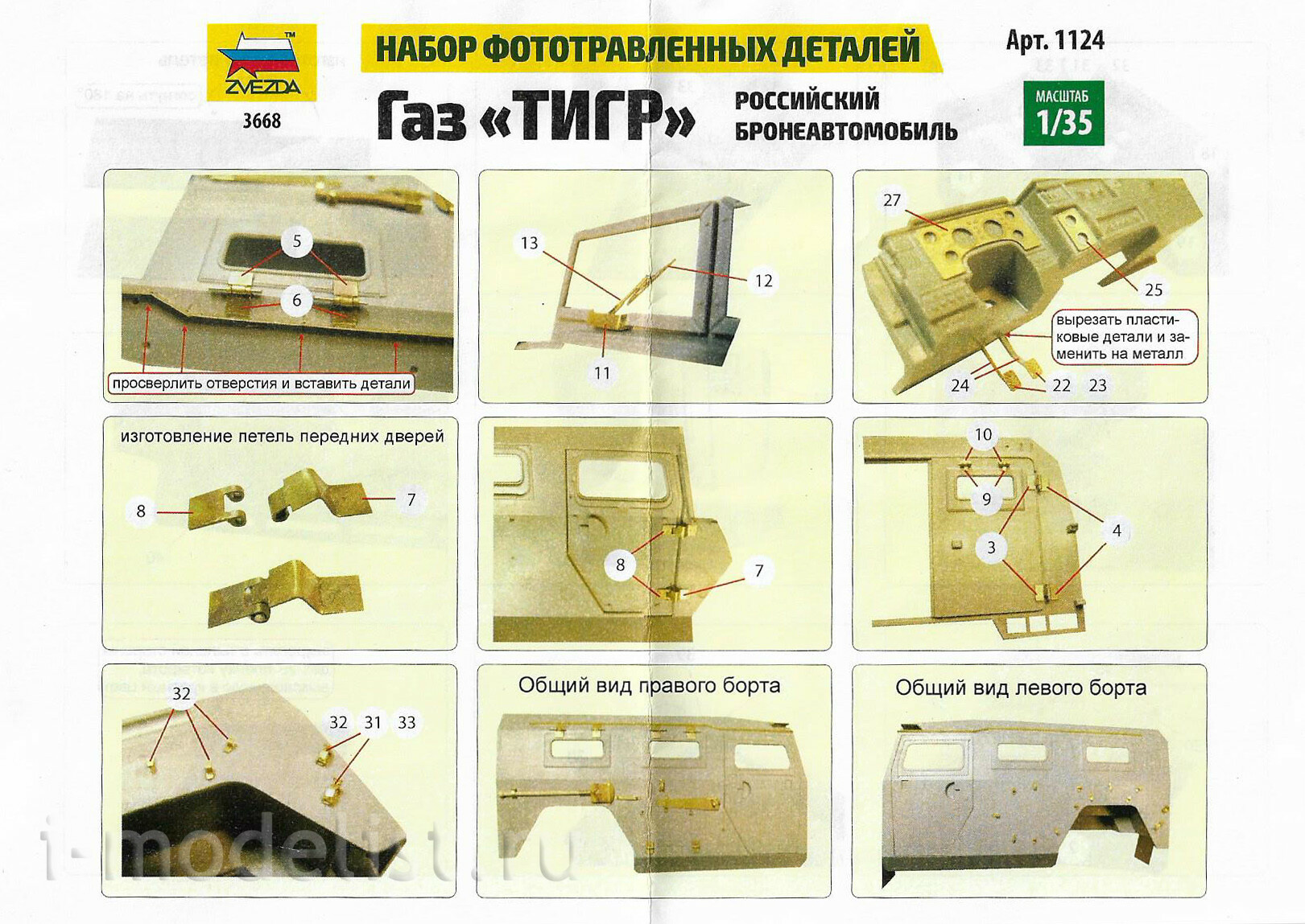 Набор фототравленных деталей для модели автомобиля ГАЗ «Тигр» в масштабе 1/35 (3668). Предназначен для замены пластиковых деталей , значительно улучшает вид готовой модели.