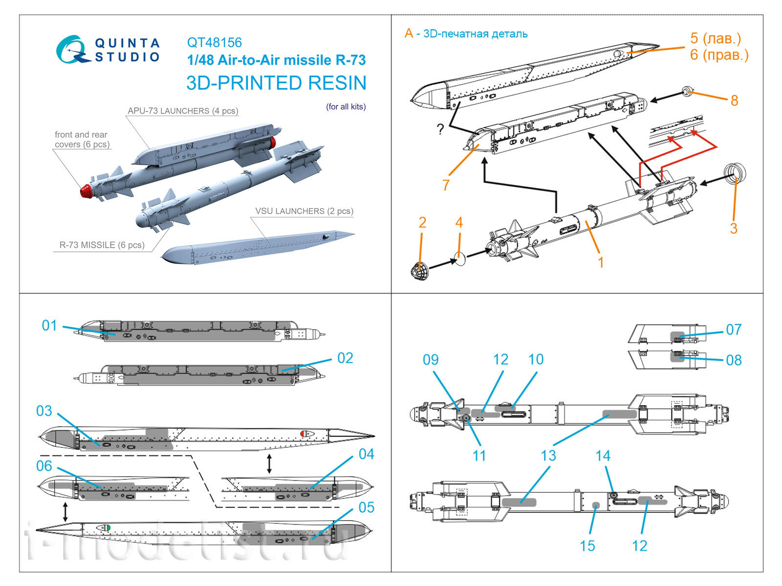 QT48156 Quinta Studio 1/48 Ракеты «воздух-воздух» Р-73 с пусковыми устройствами, 6 шт (для всех моделей)