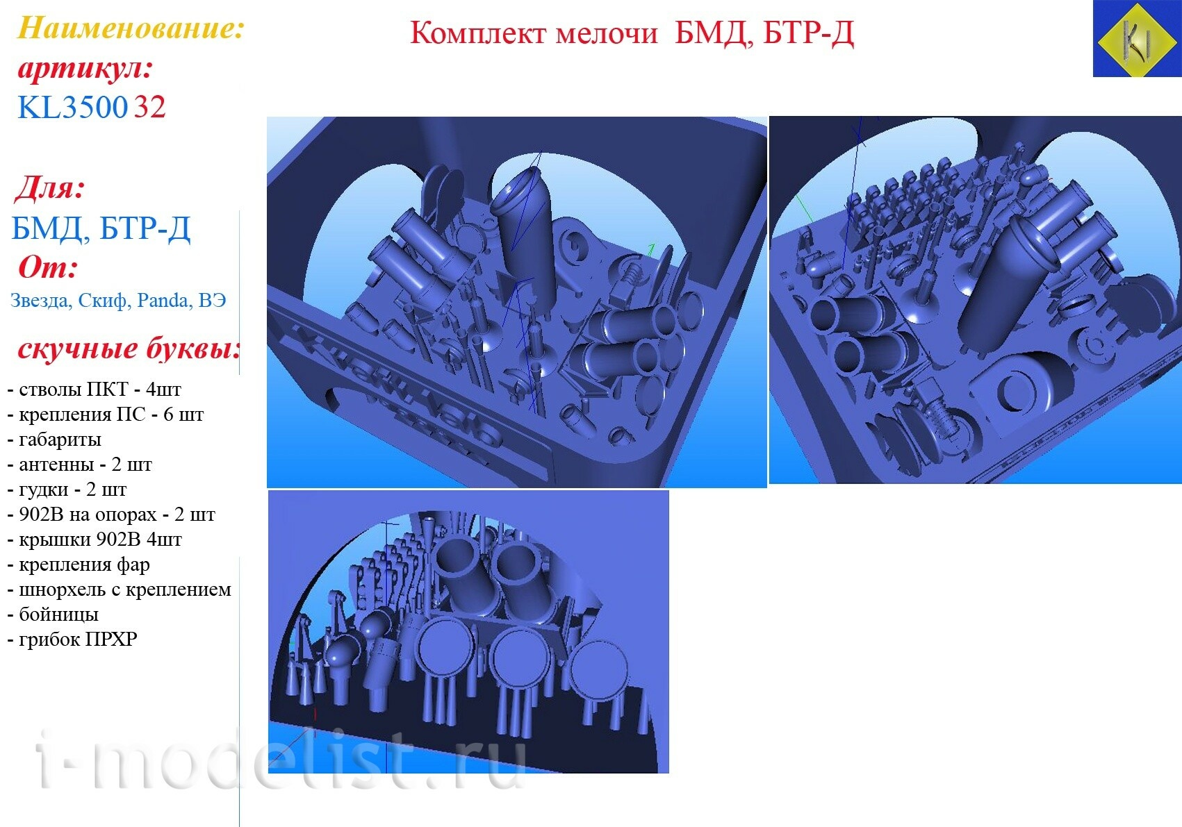 В комплекте: Стволы ПКТ - 4 шт., Крепления ПС - 6 шт., Габариты, Антены - 2 шт., Гудки - 2 шт., 902В на опорах - 2 шт., Крышки 902В - 4 шт., Крепления фар, Шнорхель с креплением, Бойницы, Грибок ПРХР.