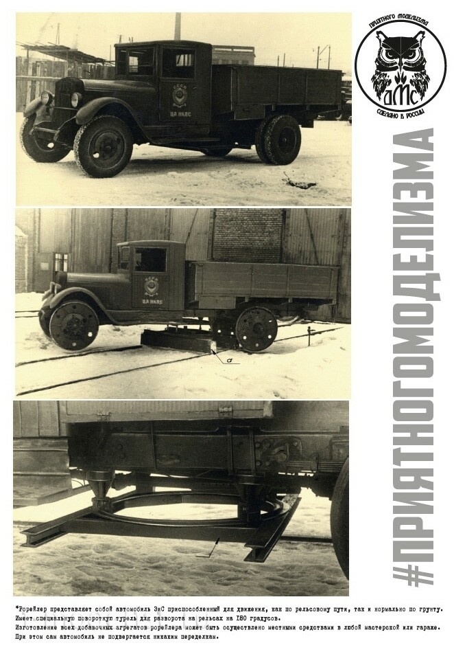 Рорейлер представляет собой автомобиль З-С приспособленный для движения, как по рельсовому пути, так и нормально по грунту.