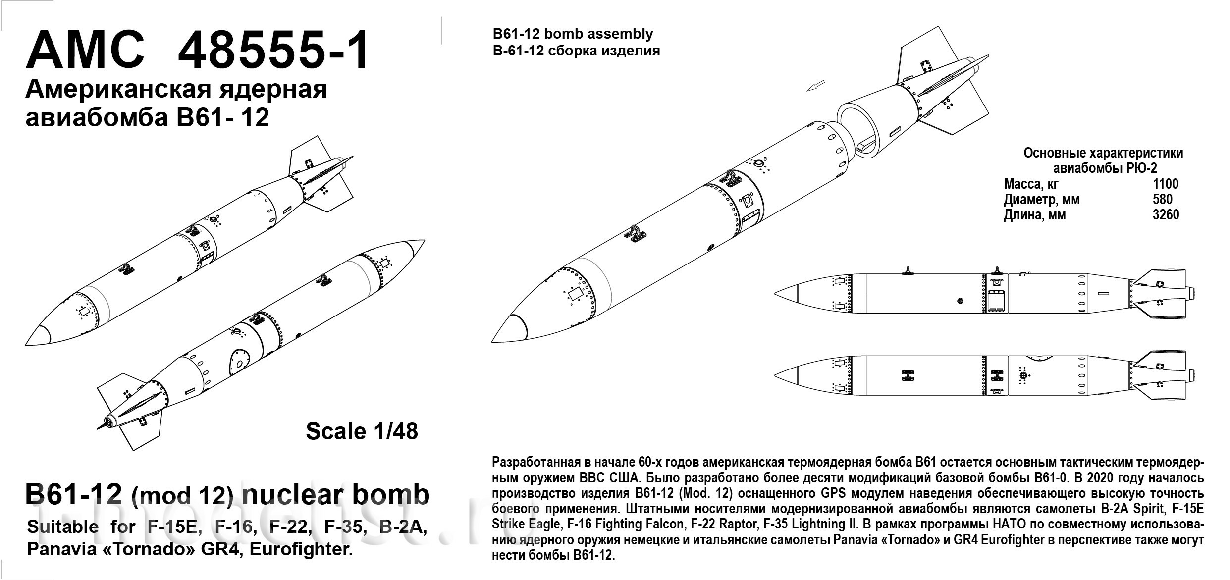 Набор для сборки американской ядерной авиабомбы В61-12 в масштабе 1/48. Детали выращены на 3д-принтере. Будьте аккуратны при отделении от поддержек. Используйте специальный инструмент и защитные очки.