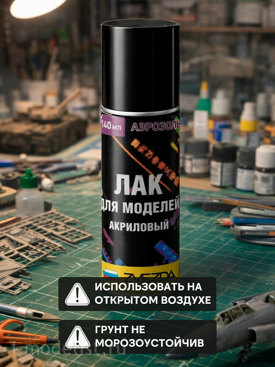 Высококачественный быстросохнущий акриловый лак предназначен для нанесения на детали из пластика на основе полистирола, а также других пластиков, используемых для изготовления моделей. Может применяться для дизайнерских и декоративно-оформительских работ. Обладает отличной адгезией, высокой стойкостью к атмосферным воздействиям, УФ излучению и механическим повреждениям. Способ применения: Перед применением тщательно встряхните баллон не менее 2-3 минут. Сделайте пробное распыление. Поверхность перед нанесением необходимо очистить, обезжирить и высушить. Глянцевые поверхности следует заматовать абразивом Р500-Р800. Нанесите 2-3 тонких слоя с расстояния 15-20 см и межслойной выдержкой 3-5 мин. Время сушки 2 ч.