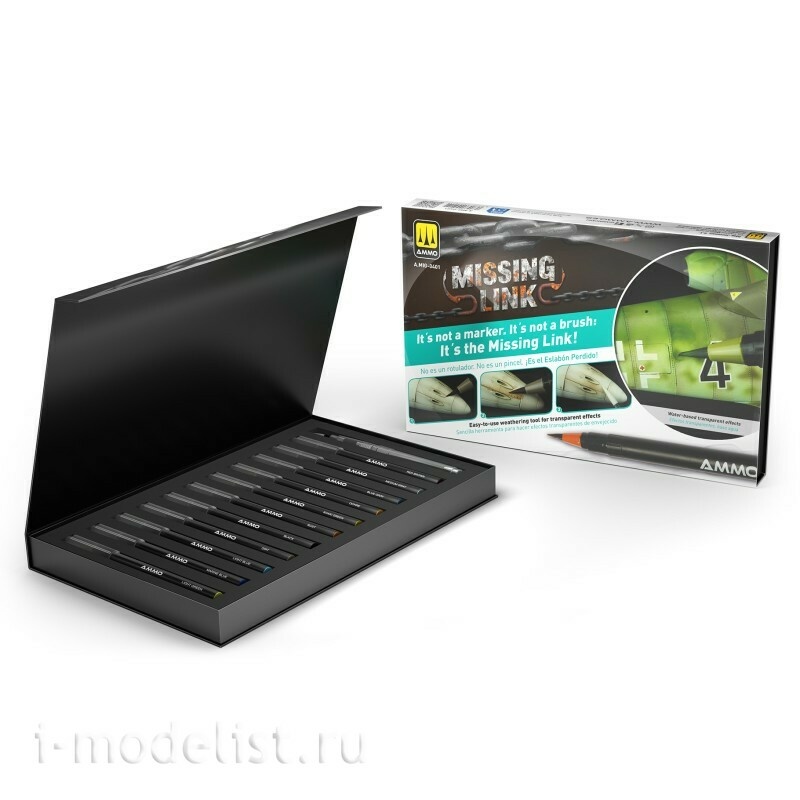 Новый набор акварельных маркеров-кистей от AMMO by MIG Jimenez представляет собой эволюцию инструментов для моделизма. Он разработан для максимальной точности, универсальности и простоты использования. Этот набор из 12 прозрачных цветов тщательно подобран для воспроизведения реалистичных эффектов на авиамоделях. С помощью маркеров Missing Link Brush Tip вы можете наносить на свои модели всё - от фильтров до эффектов старения.