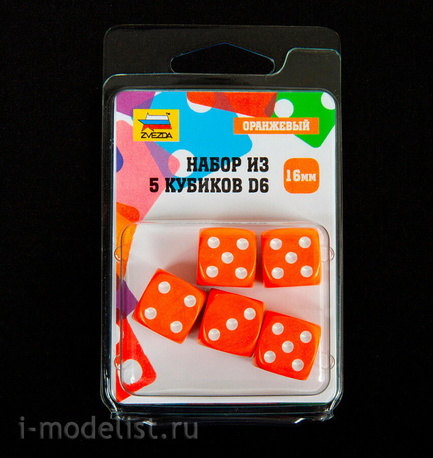 1233 Звезда Набор из 5 кубиков D6, 16мм. Оранжевый с белыми точками в блистере