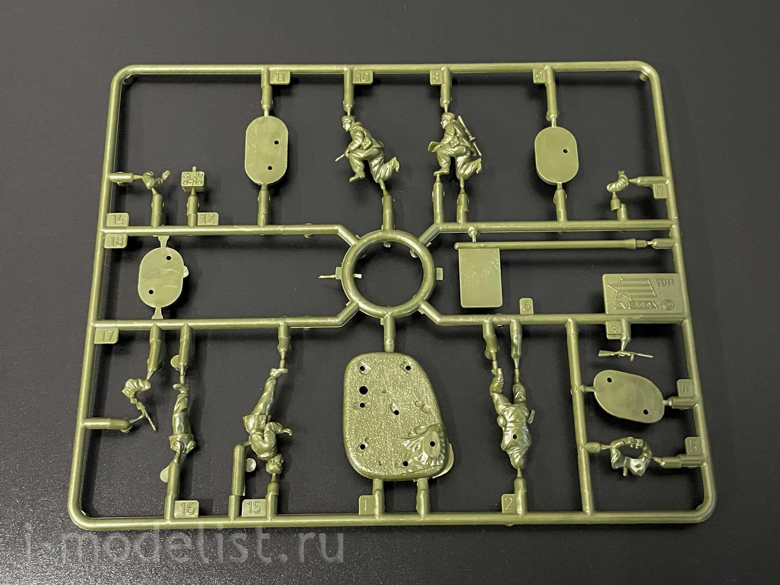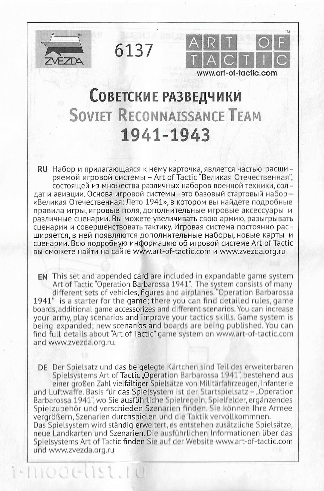 Использование разведчиков в Art of Tactic: В игре разведка является ценнейшим юнитом на поле боя. Сложно представить крупное сражение без этих специалистов. Заминировать мост, перейти болото, остаться незамеченным для врага и донести важные сведения своему командованию, навести свою авиацию, произвести пристрелку артиллерии всё это разведка. Стоит отметить третью защиту и скрытность передвижения. И минусов отметим малый боекомплект и уязвимость для танков и бронетехники врага. Набор деталей для сборки 4-х неокрашенных солдатиков.