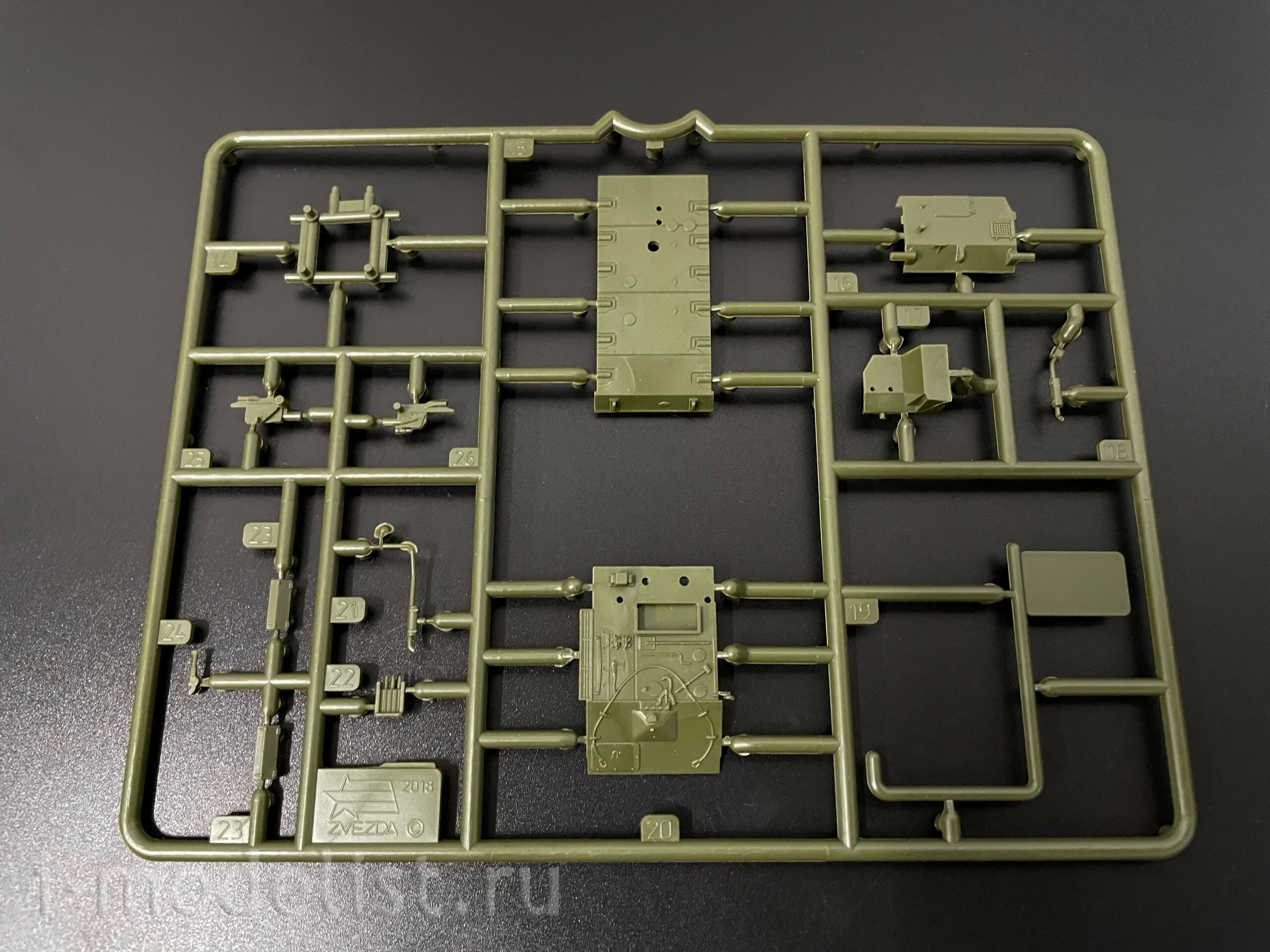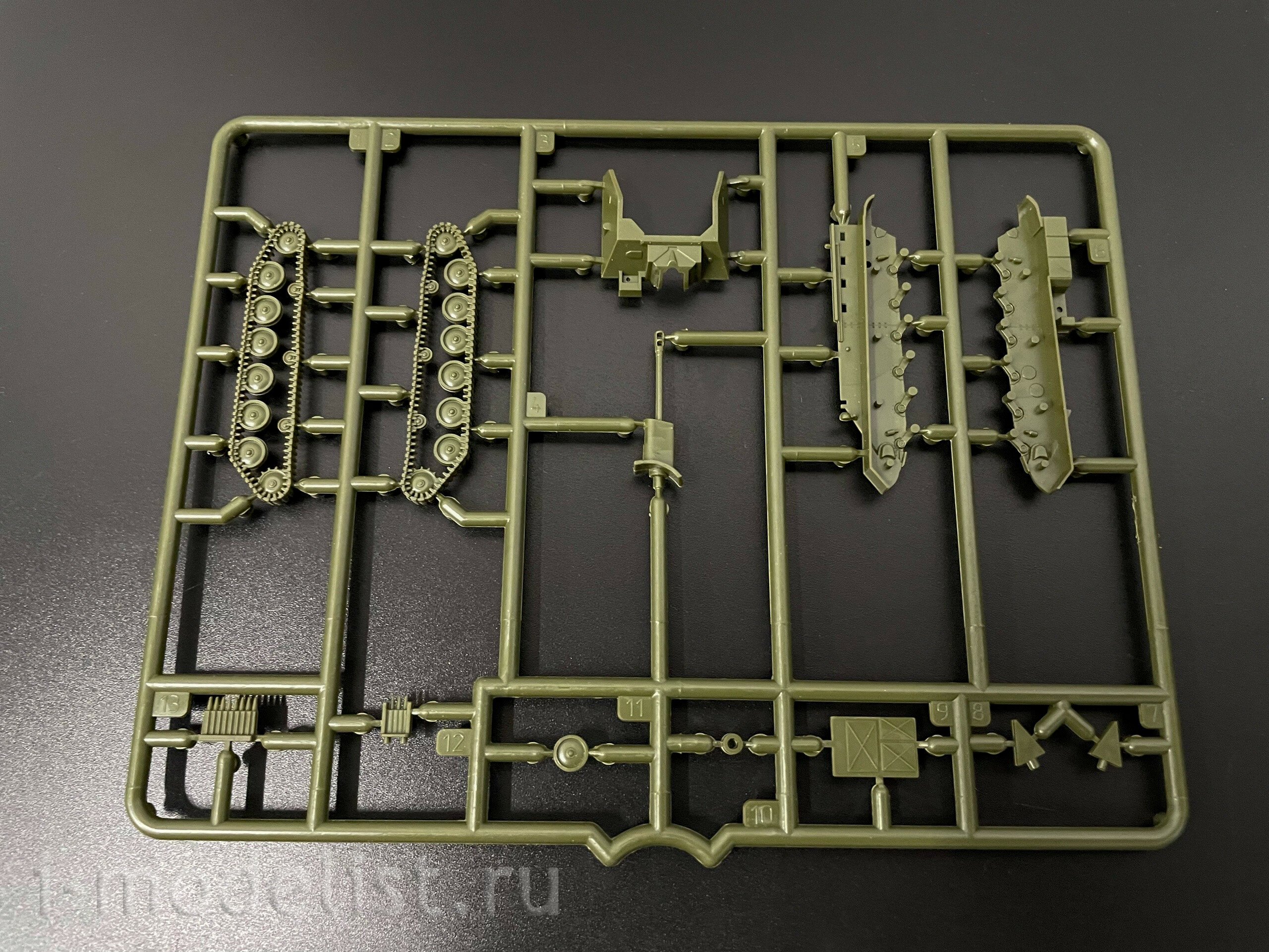 Набор деталей из пластмассы для сборки одной модели танка.