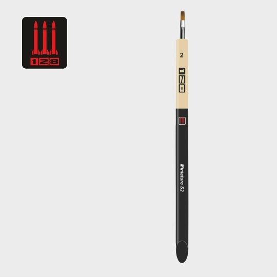 Кисть "128" Miniature S2 №2 - плоская кисть из синтетики имитации колонка отлично подходит для раскрашивания крупных участков на пластиковых моделях, а также для склеивания их; хорошо скользит по поверхности, обеспечивая превосходный результат; идеально разгружает напряжение с руки при работе с миниатюрой. Анодированная алюминиевая обойма надежно защищает волос от слома и выпадения, что является важнейшим фактором при работе с мелкими деталями. Для удобства и более крепкой фиксации в руке место, где художник держит кисть, не окрашено. Легкая и бесшовная ручка утолщенной формы обеспечивает комфорт при долгой работе с кистью. С другой стороны заострённый край ручки можно использовать для поправки рисунка или в качестве шпателя.