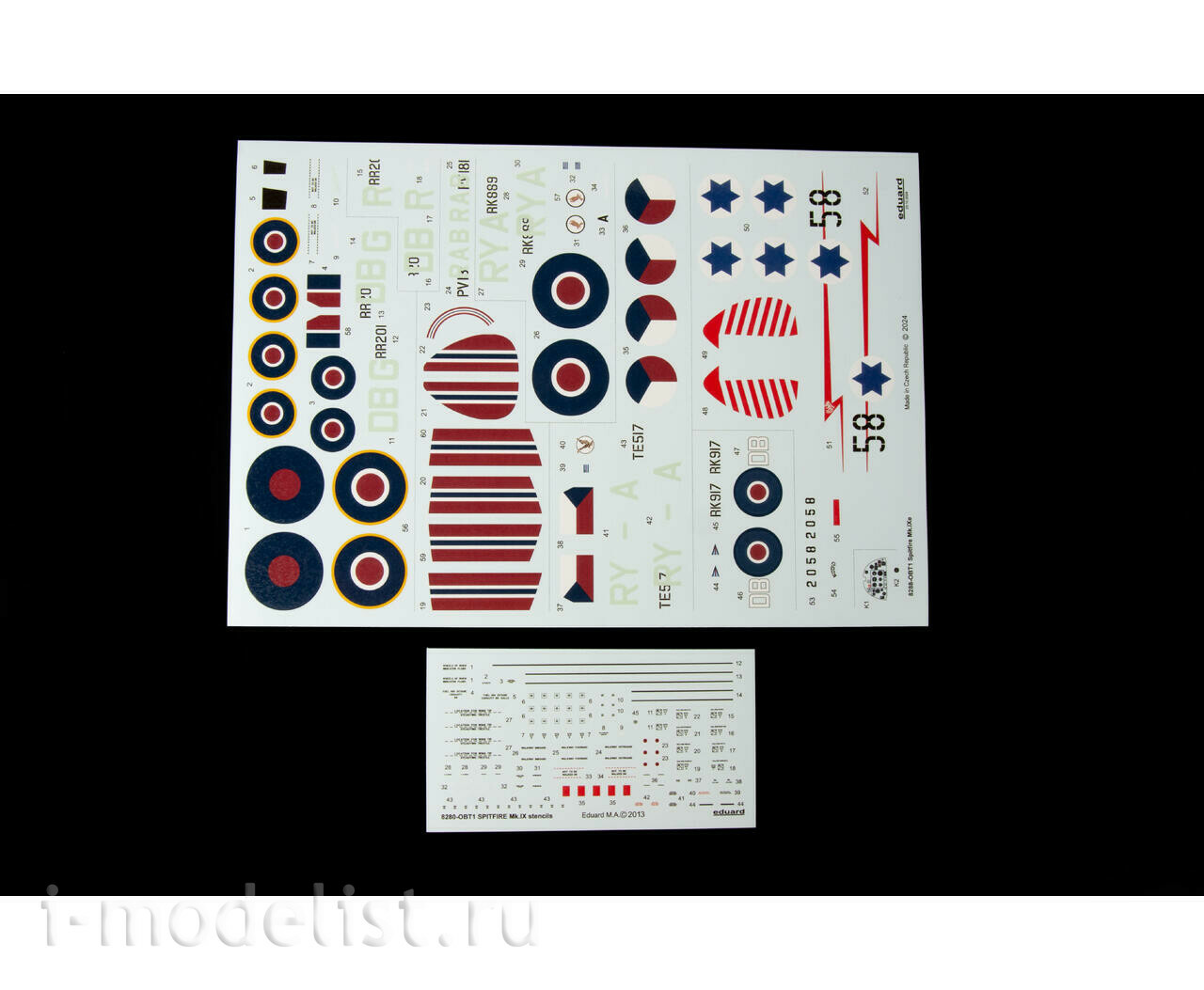 Комплект предназначен для сборки Spitfire Mark Nine, служащего в Королевских ВВС, ВВС Чехословакии и ВВС Израиля.