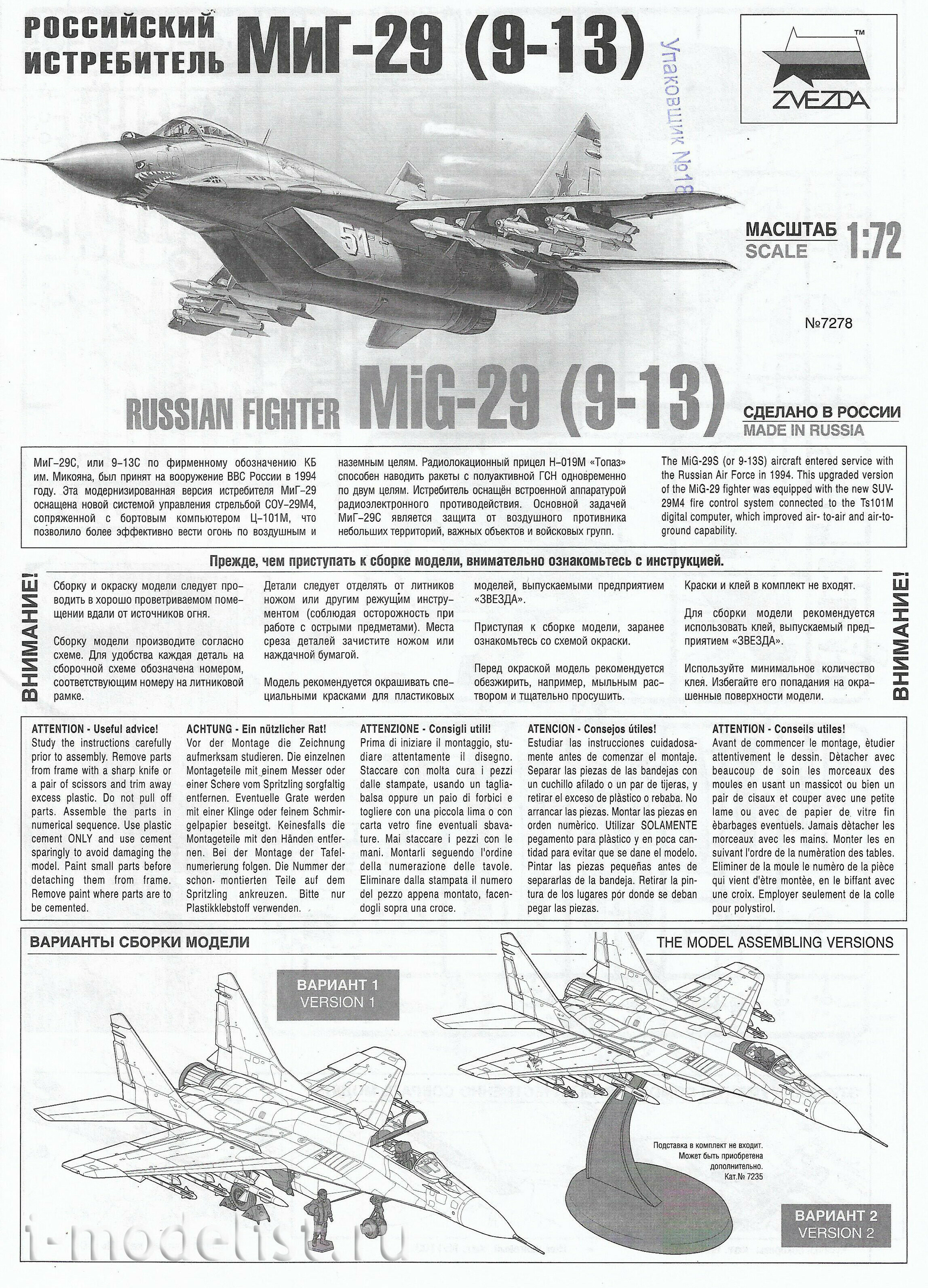 7278ПН Звезда 1/72 Подарочный набор: Российский истребитель "МиГ-29" (9-13)