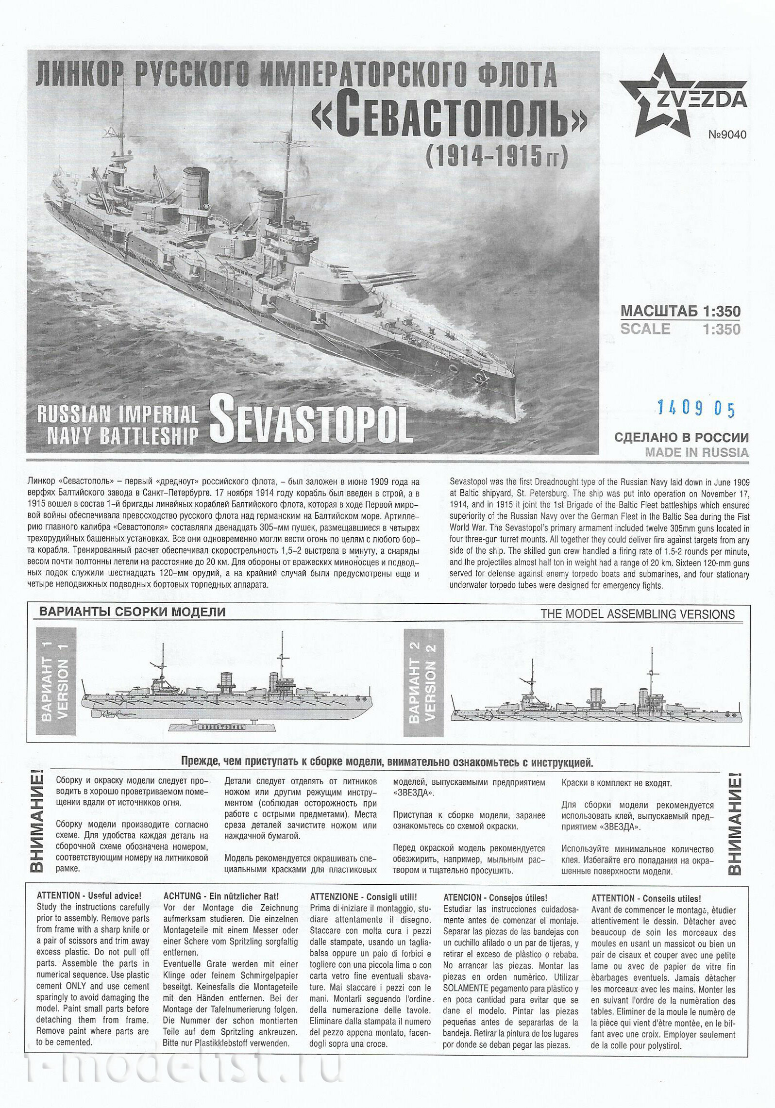 9040 Звезда 1/350 Линкор русского императорского флота "Севастополь"