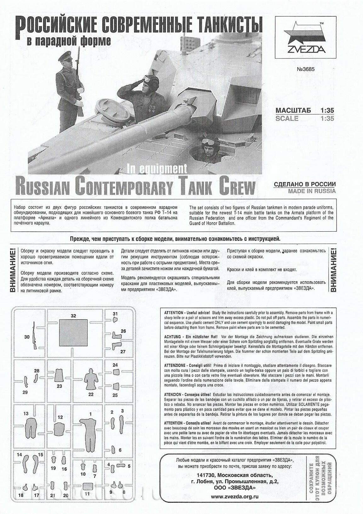 Набор состоит из двух фигур российских танкистов в современном парадном обмундировании, подходящих для новейшего основного боевого танка РФ Т-14 на платформе «Армата» и одного линейного из Комендантского полка батальона почётного караула.