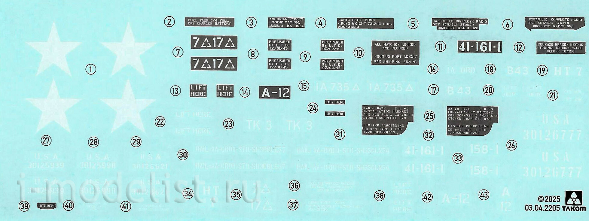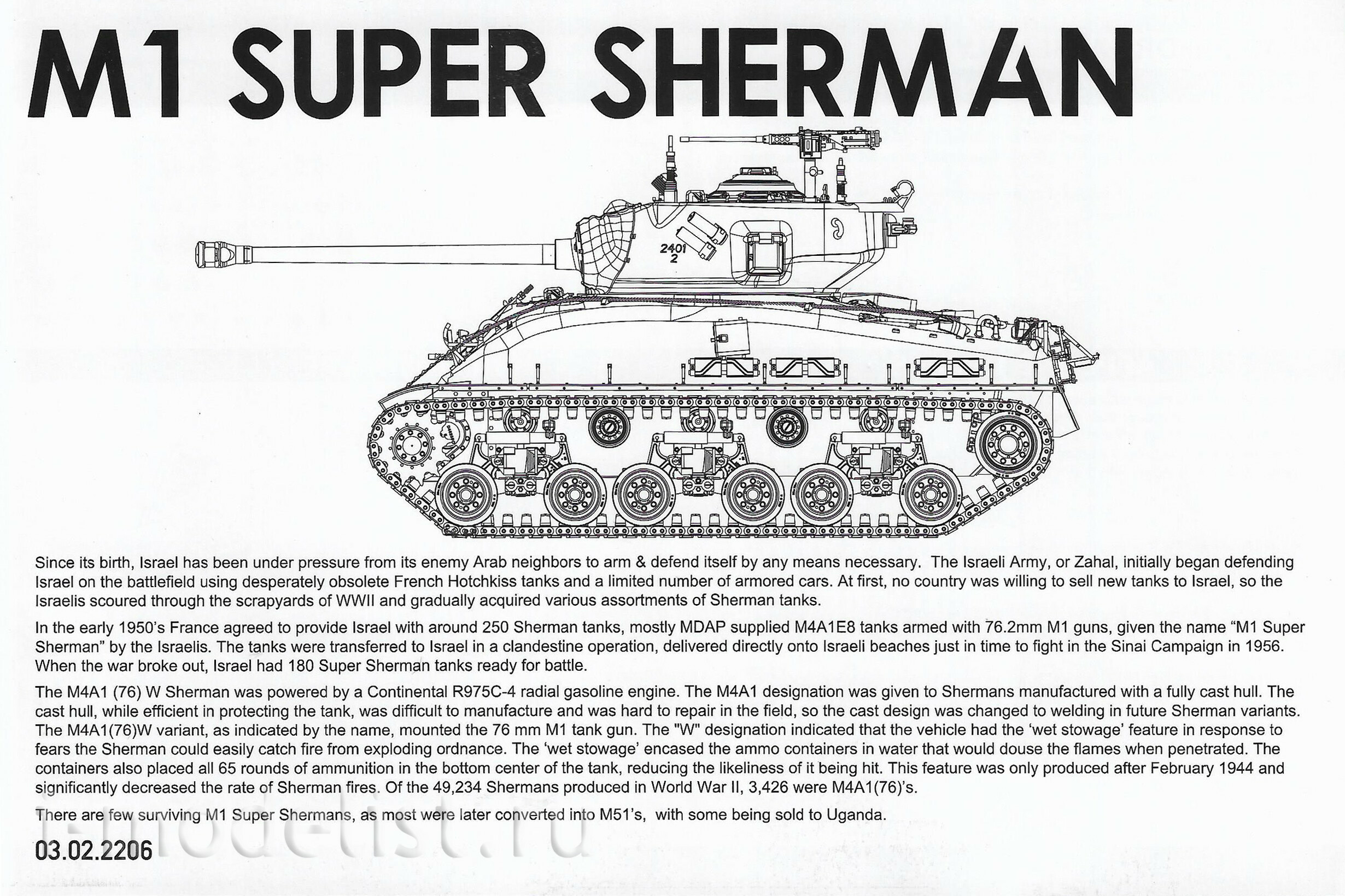 - M1 Super Sherman. Артикул 2206. В набор входит пластиковый скарб (брезентовые скатки, подсумки, закрытый чехол командирской установки, зпу, ведёрки, носилки).