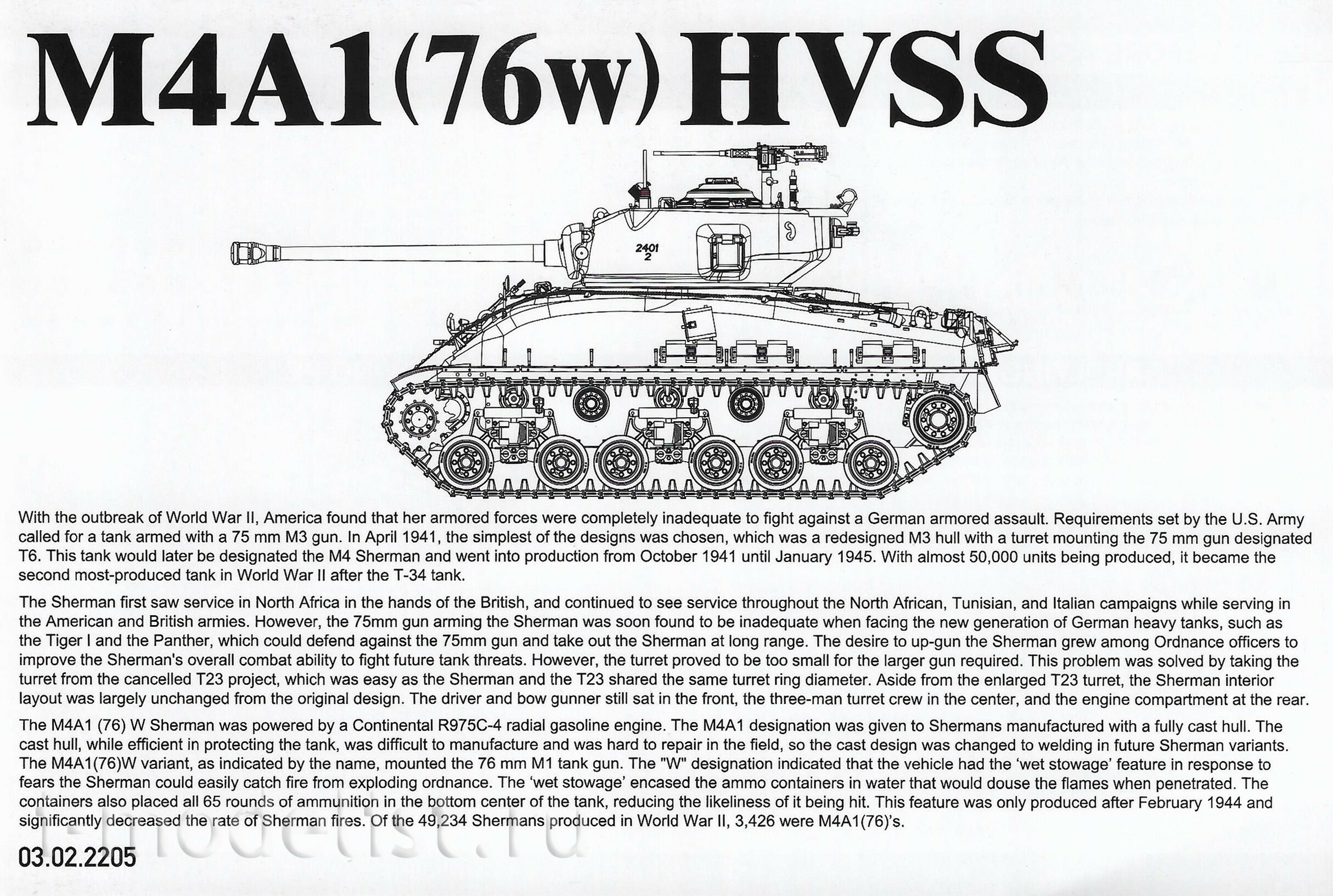 - M4A1(76w) HVSS. Артикул 2205. В набор входит брезентовый чехол маски орудия (из пластика), два варианта грязезащитных крыльев, бортовые юбки, фигурка танкового стрелка в масштабе 1/35.
