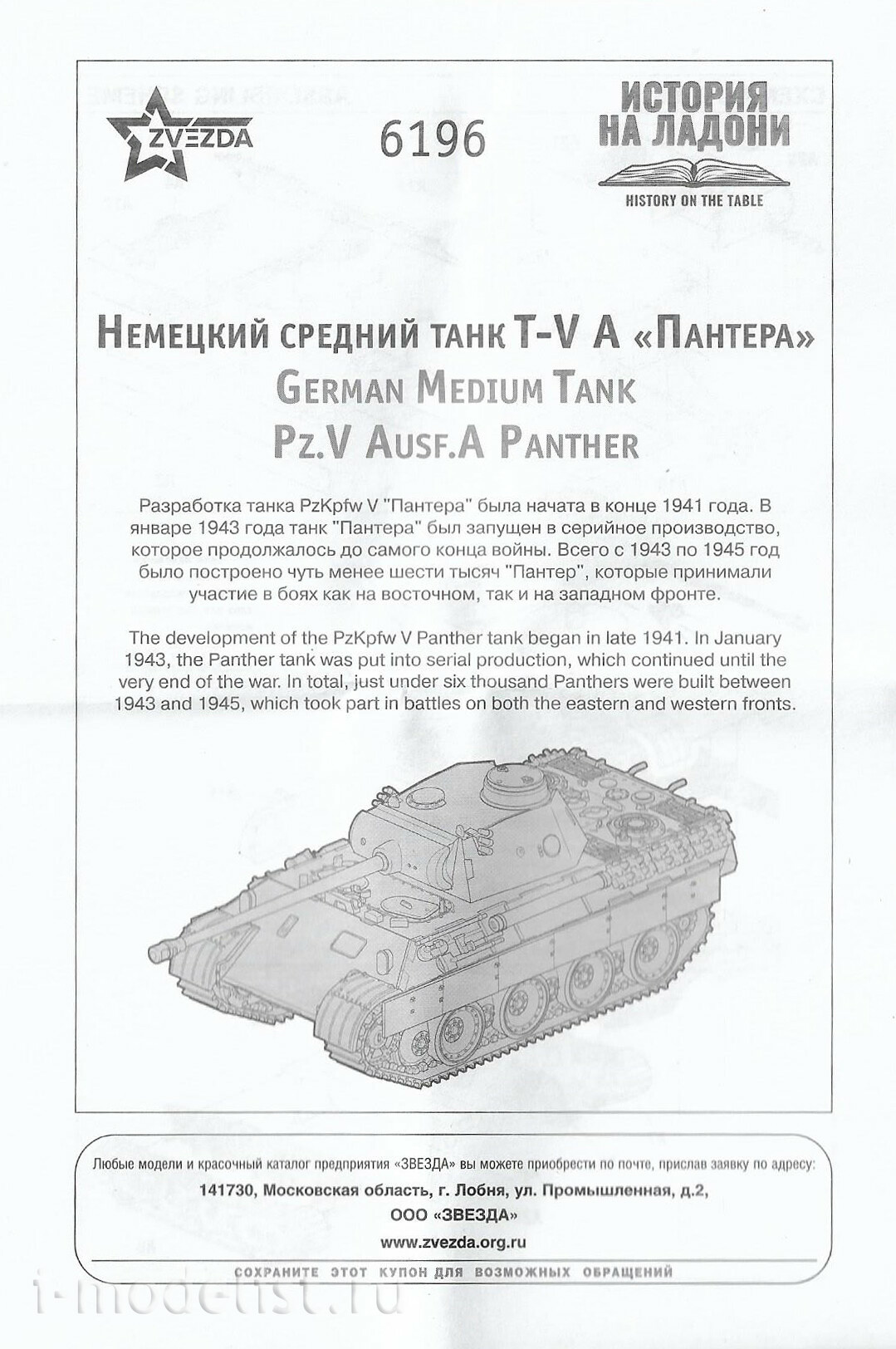 Модель собирается "на щелчок", без использования клея. Благодаря новейшим технологиям, применявшимся при разработки модели, все детали превосходно стыкуются между собой. Копийность модели, как всегда, на высоте: ее очертания полностью соответствуют прототипу, и, при этом, для такого малого масштаба она очень хорошо детализирована. Модель танка PzKpfw V "Пантера" украсит собой как коллекцию моделиста, так и армию игрока в настольные военно-исторические игры.