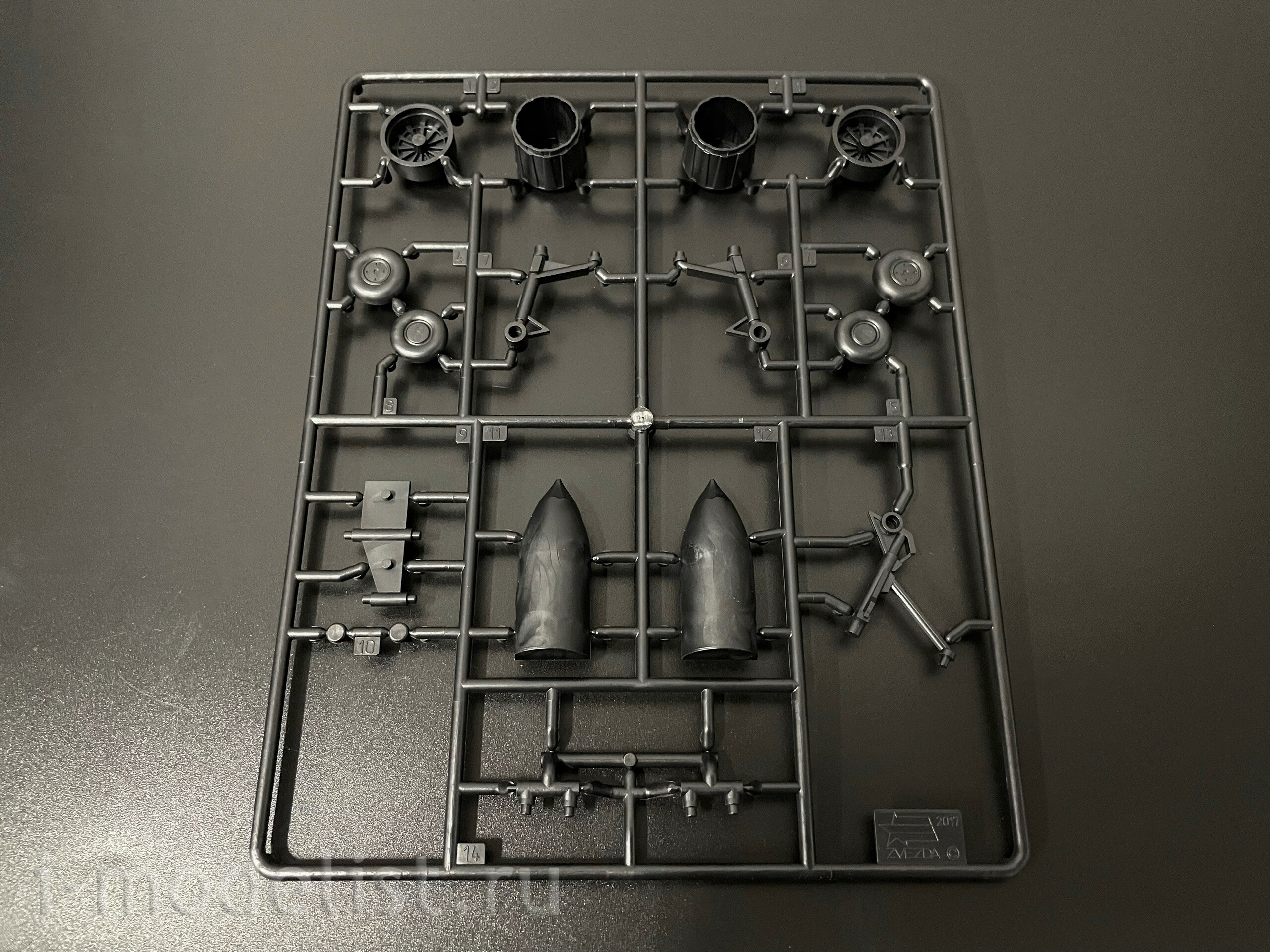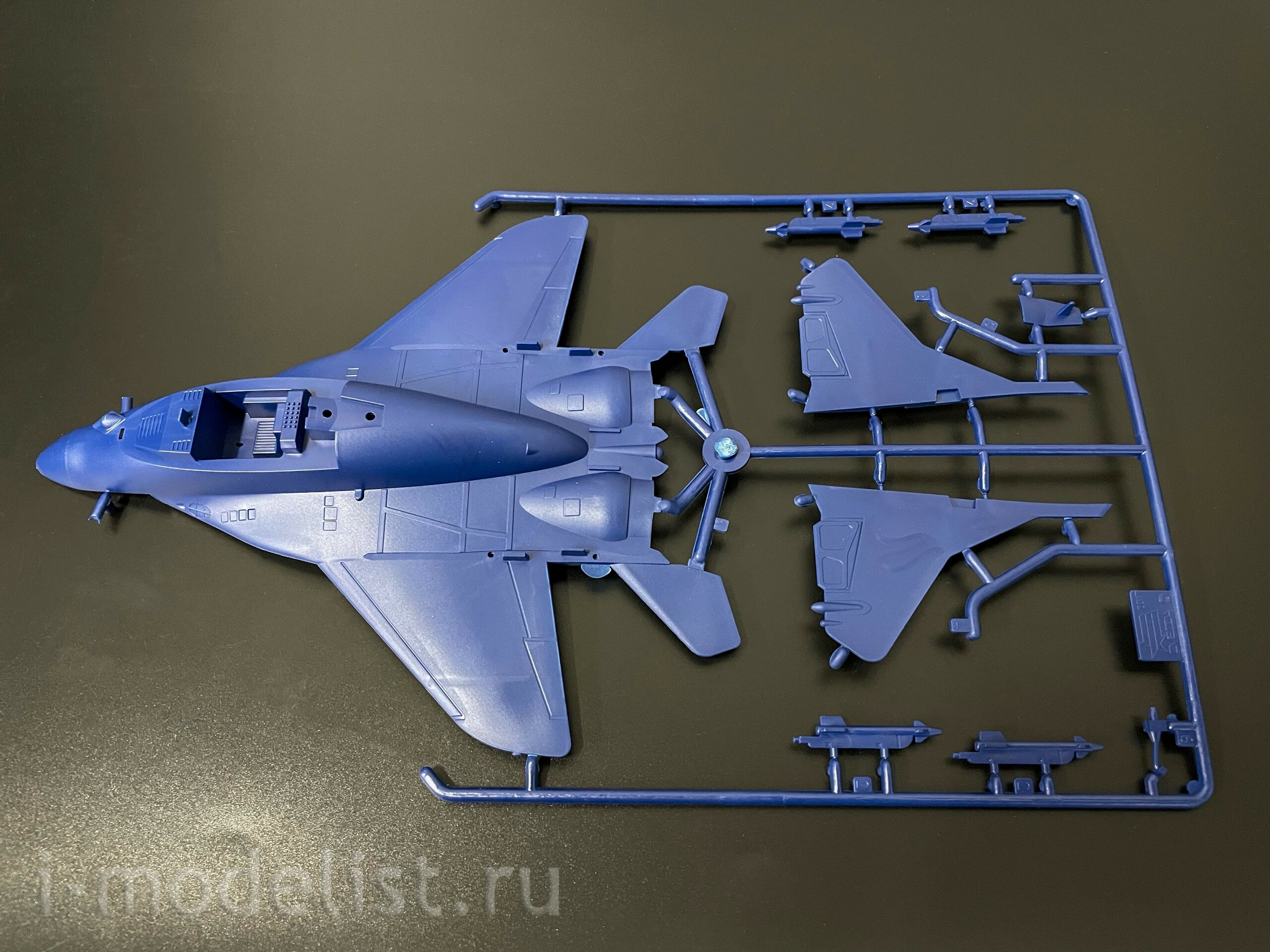 Набор деталей из пластмассы для сборки одной игрушки истребителя.