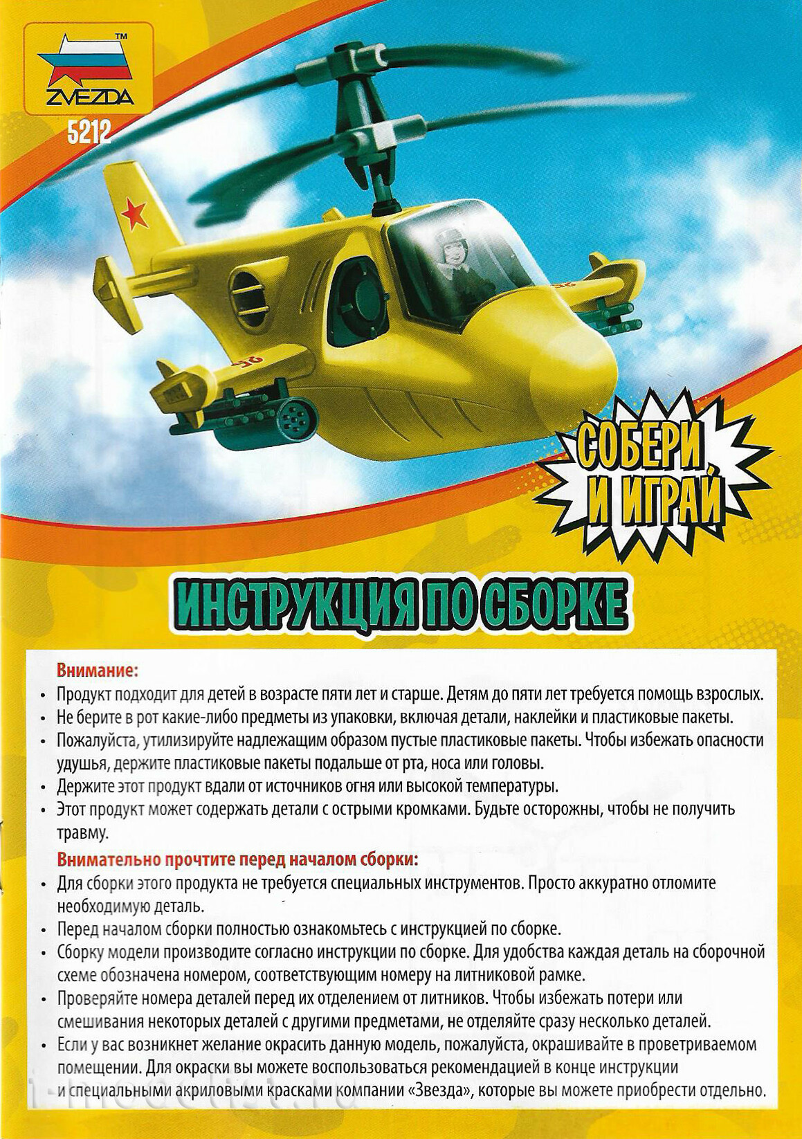 Сборные игрушки от компании «Звезда» увлекут вашего ребёнка в мир военной техники и познакомят его с самыми интересными современными защитниками Родины. С помощью ярких пластиковых элементов, которые легко соединяются между собой, ребёнок сможет собрать «Российский вертолёт», чтобы играть с ним на улице или дома. Во время сборки модели особенно развиваются мелкая моторика, логическоеи пространственное мышление, творческие способности, а также концентрация внимания и усидчивости. Родителям всегда хочется, чтобы дети разделяли с ними интересы и увлечения, но зачастую порог вхождения в моделизм слишком высок для юного поколения. Выход найден – встречайте абсолютно новую линейку детских моделей «Собери и играй!»